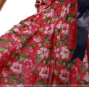 Larga, de tela roja con estampado floral en colores vivos (blanco y verde principalmente).