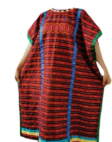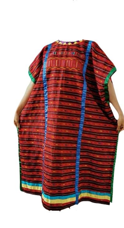 Prenda: huipil largo de color rojo con franjas horizontales blancas y bordados geométricos.